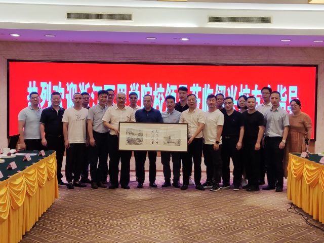 座谈会上,应敏向绍兴校友代表一一赠送了万里师生共同创作的字画牌匾。字画左右两侧分别是手绘的绍兴著名景点会稽山和学校标志性建筑空中花园,中间题字“越甬同舟,共济万里”,表达对校友的感恩、感激之情。