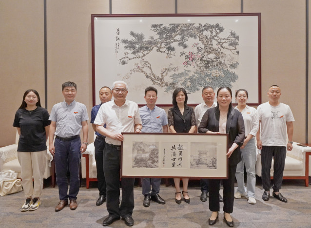 应敏向胡敏赠送了万里师生共同创作的字画牌匾。字画牌匾由手绘的绍兴会稽山和学校标志性建筑空中花园以及“越甬同舟,共济万里”题字组成,以表达我校师生对绍兴的感恩之情。