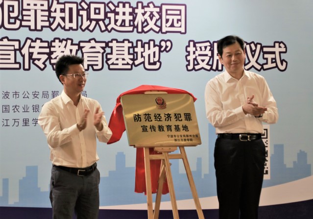 宁波市鄞州区公安局浙江万里学院“防范经济犯罪宣传教育基地”是浙江省防范经济犯罪宣传在高校建立的首块基地。这是新时代下宁波市公安局鄞州分局学习贯彻党的十九届四中全会精神和习近平总书记关于立法工作重要指示精神,扎实推进区域治理体系和治理能力现代化的重要举措。基地是鄞州区公安经侦部门充分发挥社会资源优势,把防范宣传阵地前移到大学校园,推动经济犯罪预防教育工作常态化和社会化的新实践。