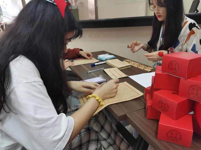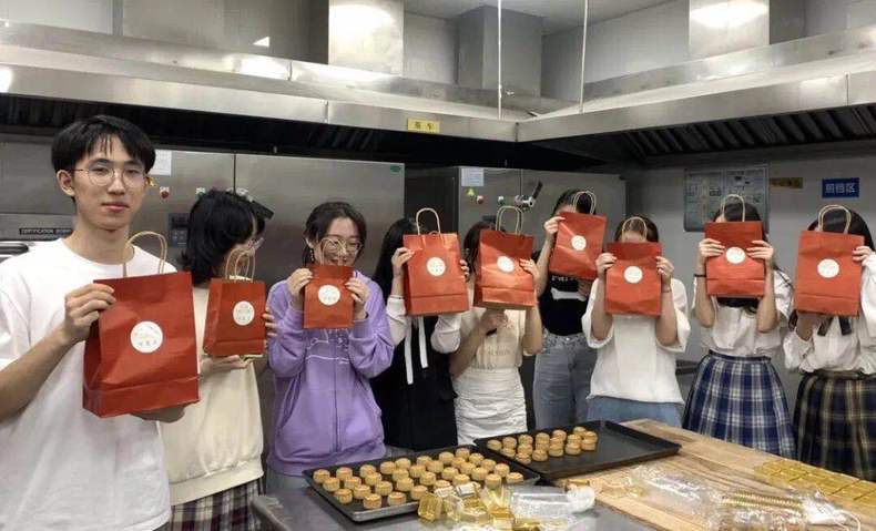 由食堂的阿姨纯手工制作的月饼“万里月”不仅在食堂出现,没有回家的学生也参与到制作“万里月”的过程中,还参与了绘画传统灯笼的环节。