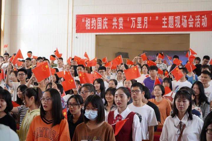 10月1日上午,基础学院团委组织开展了“相约国庆 共赏‘万里月’”主题会活动,300余名在校新生参与了该活动。现场会活动设计了一系列扣人心弦又趣味盎然的环节,包括“我和我的祖国”大合唱、短片欣赏、电影观看、互动游戏等,现场还准备了精美的果盘、惊喜礼品袋、“万里月”。