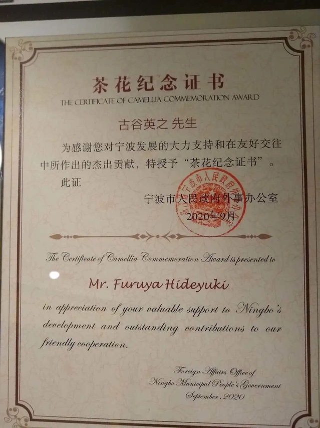 10月9日下午,2020年宁波市茶花友谊证书授予活动举行。市委副书记、市长裘东耀出席活动并致辞。我校日本外教古谷英之先生被授予2020年宁波市茶花纪念证书。
