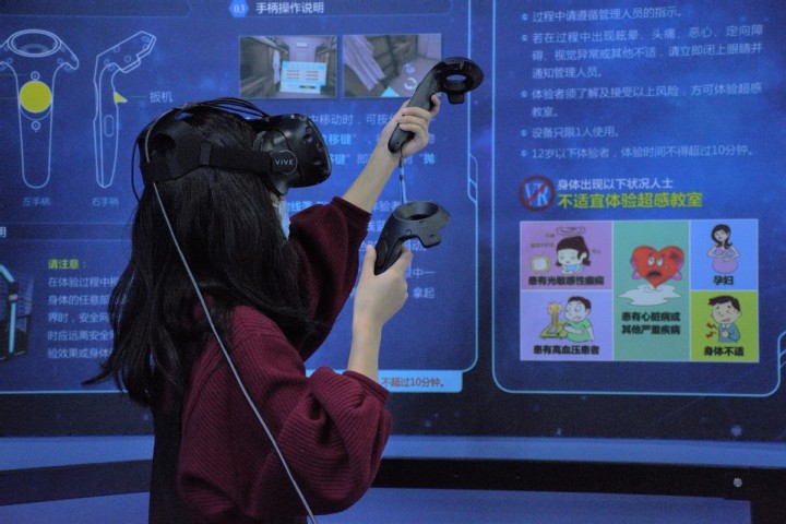 在馆长姚枫凤的引导下,同学们在教室内接受学习后,前往体验区开始体验。在VR地震模拟现场,体验者匍匐在地不断躲避可能出现的威胁;在灭火实训区,体验者根据起火物各自的特点选择适合的灭火器扑灭火源。