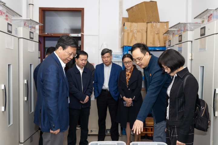 陈根芳实地参观了生物与环境学院分析测试中心、水生动物养殖实验室、海藻高值化利用公共服务平台以及龟鳖动物性别控制实验室,应敏、钱国英介绍了我校生物与环境学院人才培养、建设历程、研究方向、平台建设等情况,展示了学院最新研究创新成果。陈根芳还考察了动物性别与发育研究所,与所长葛楚天教授亲切交谈,赞许其三十多岁有“板凳坐得十年冷”的沉潜研究精神,在近三年中在国际顶级期刊《Science》连发两篇理论研究文章,并深入询问其研究成果的应用前景,龟鳖类动物性别控制的奥秘,目前国际国内该领域研究的进展,葛楚天一一作答。随后,陈根芳参观了一号教学楼,蒋建军介绍了我校党建和“生活思政”实施成效。应敏还就产教融合、社会服务、教学环境等方面向省厅领导作了汇报。