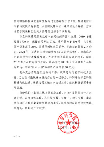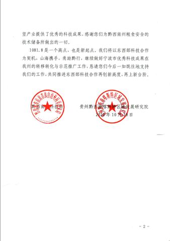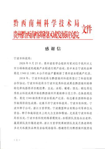 信中感谢我校及另外3个相关单位,按照市委市政府决策部署和宁波科技局扶贫协作与对口支援山海协作工作具体安排,聚集产业发展、严密组织、精心实施,舍得拿出好的农业新品种、真技术在黔西南州等地转移转化、示范推广。
