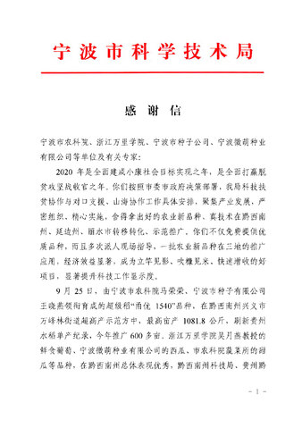 在感谢信中提及,“浙江万里学院吴月燕教授的鲜食葡萄在黔西南州总体表现优秀”“浙江万里学院果树团队及吴月燕老师的多次无私提供品种及亲临现场指导,感谢你们为黔西南州脱贫攻坚产业提供了优秀的科技成果,感谢你们为黔西南州粮食安全的技术储备所做出的一切。”