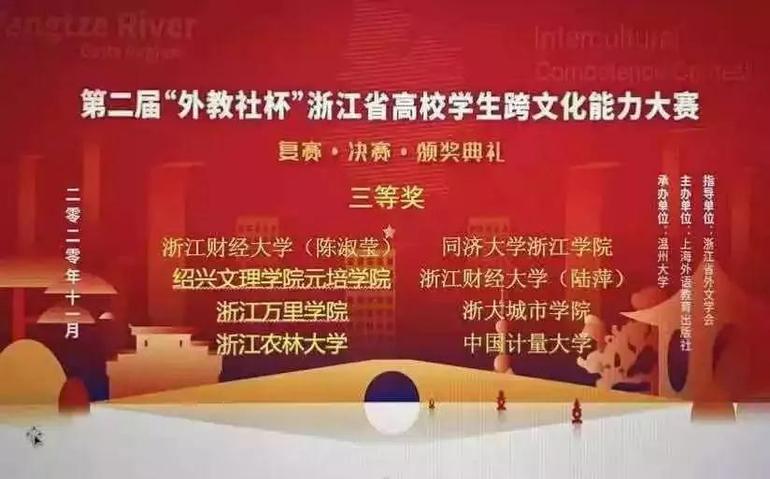 11月28日,第二届“外教社杯”浙江省高校学生跨文化能力大赛以线上比赛的形式举行。本次比赛在浙江省外文学会指导下,由上海外语教育出版社主办,温州大学承办。我校外语学院商务英语184班的陈楠、商英2002班的喻铃灵、留学生Natinael Yoseph Berhie同学组成的参赛队伍获三等奖。