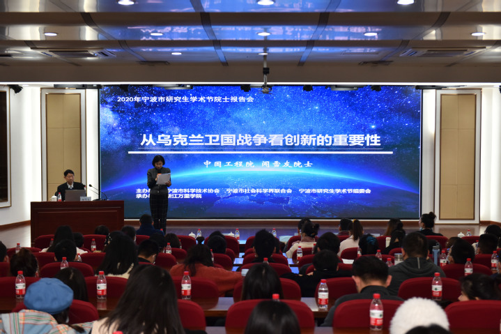 12月3日下午, 2020年宁波市研究生学术节院士报告会在我校图书馆报告厅举行。中国工程院闻雪友院士作题为“从乌克兰卫国战争看创新的重要性”的报告,来自宁波各相关高校的师生代表200余人参加了报告会,报告会由我校副校长钱国英主持。
