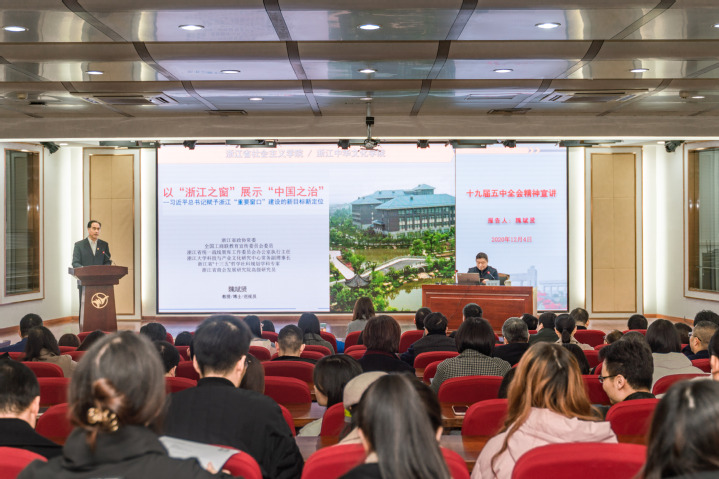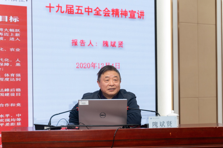 为深入学习贯彻党的十九届五中全会精神,按照中青年干部暨第二期中青年骨干培训班、基层党支部书记培训班既定课程安排,12月4日下午,浙江省政协常委、省社会主义学院一级巡视员隗斌贤受邀来我校作党的十九届五中全会精神专题宣讲报告。全体中层干部,中青年干部培训班、中青年骨干培训班成员、基层党支部书记、学生党员代表参加了此次报告会。校党委书记蒋建军主持会议并讲话。