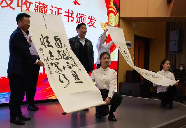 开幕式上,省新四军研究会将五幅书画作品和《“墨韵富美之江”书画作品集》赠与了学校。