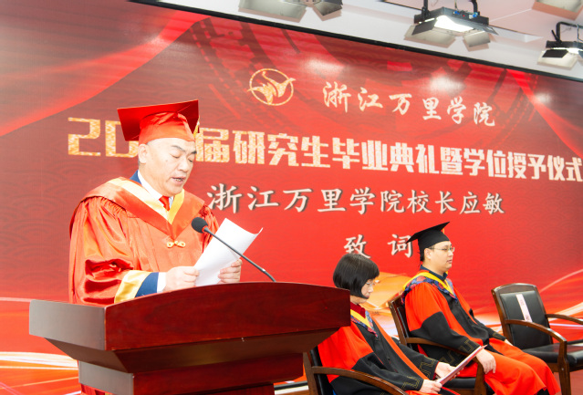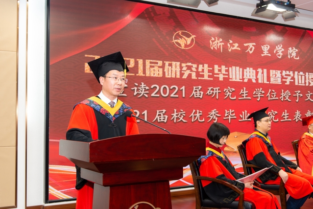 应敏首先代表学校对顺利完成学业的2021届研究生表示衷心的祝贺,向为其成长成才付出辛勤汗水的老师、员工和家长们致以衷心的感谢,并对2021届研究生提出了殷切期望:要胸怀祖国,心系天下;要仰望星空,追求卓越;要脚踏实地,行稳致远。他希望同学们在追求理想的道路上,牢记万里人“只要有1%的希望就要尽100%努力”的精神,勇于担当、锐意进取,做新时代最优秀的“打工人”!