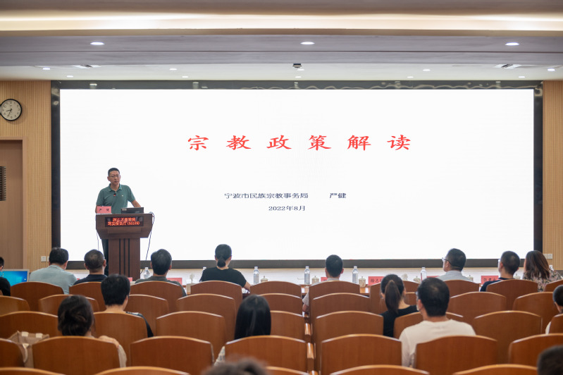 宁波市民宗局一处调研员严健以高校宗教工作为主题作了主题报告,他强调我们必须要深刻认识做好宗教工作在党和国家全局中的重要性,必须始终坚持党的宗教工作基本方针,要用“导”的理念做好宗教工作,做到导之有为,导之有力。