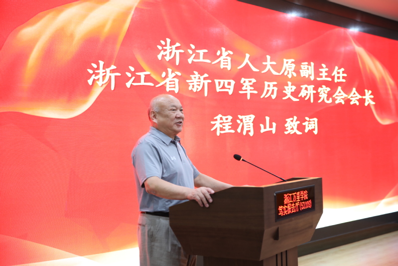 程渭山致辞。他说,省新四军历史研究会的宗旨与使命是研究浙江省新四军历史,传承红色基因,弘扬“铁军精神”,这与浙江万里学院对红色文化的研究传承以及思想政治教育的重视是一致的。他在回顾了浙东抗日根据地的历史与贡献后表示,为纪念浙东抗日根据地建立80周年,省新四军历史研究会用书画的形式纪念历史,告慰先烈,并希望青年学子不仅要有扎实的专业知识,更要有为国为民的情怀,在新时代拥有新格局、新思想,勇立潮头,为当好“重要窗口”的建设者贡献青春力量。
