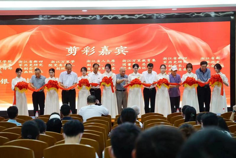 浙江省人大原副主任、浙江省新四军历史研究会会长程渭山,浙江省新四军历史研究会副会长兼学术委员会主任高三山、副会长兼书画院院长骆振龙、秘书长李军,浙江省新四军历史研究会书画院副院长吕雪梅、吴明儿、王爱平,浙江省新四军历史研究会学术委员会秘书长张建秋,浙江省新四军历史研究会书画院院长助理叶剑波,浙江省万里教育集团总裁林良富,校党委书记蒋建军,校党委委员、党委宣传部部长王福银,以及艺术届代表出席活动。开幕式由学校党委副书记、副校长王伟忠主持。