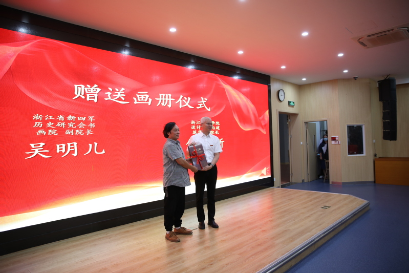 浙江省新四军历史研究会专家代表为我校参展教师代表颁发证书,吴明儿代表研究会书画院向我校赠送书画作品册,我校设计艺术与建筑学院院长傅立新接受赠书。