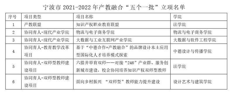 近日,宁波市2021-2022年产教融合“五个一批”正式公布,我校知识产权职业教育联盟、物流与电子商务学院、大数据与工业互联网产业学院等6个项目立项。