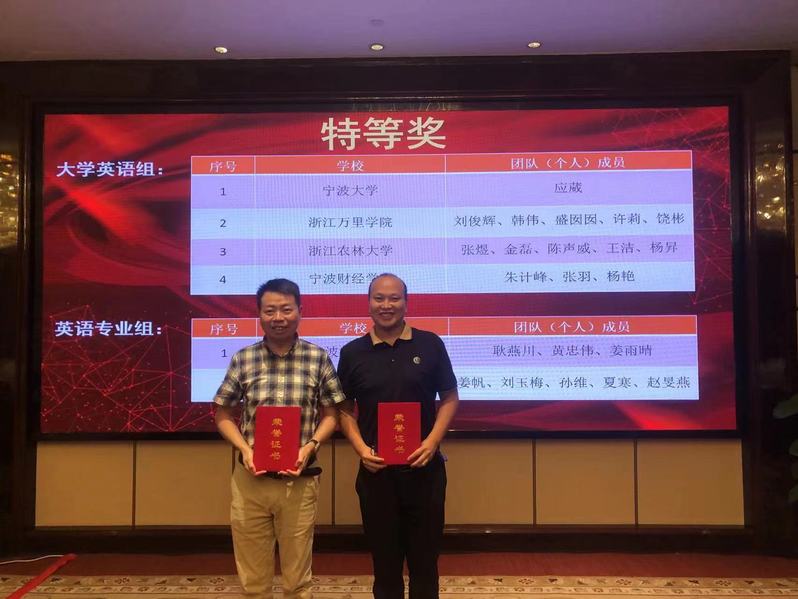 9月30日,2022年浙江省高等学校(本科)外语课程思政优秀教学案例征集与交流活动第二阶段线下活动(暨浙江省赛)在杭州落下帷幕,我校外语学院大学英语语言中心刘俊辉、韩伟、盛囡囡、许莉、饶彬教师团队总分名列大学英语组第二,获特等奖并进入全国总决赛。