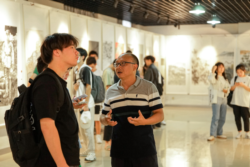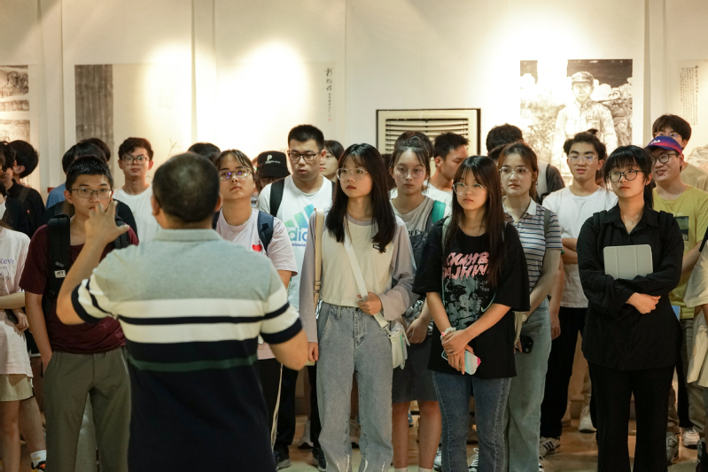 “1942年,在画中这片区域,曾诞生过中国19个抗日根据地之一并且是最后一个根据地——四明山革命根据地,短短3年时间经历了600多次战争,为中国抗日事业做出了巨大贡献。”展厅里,吴忠为同学们依次梳理绘画中的历史脉络,并从画体选择、画面构图、色彩运用、笔触设计等方面向同学们解析作者意图及绘画技巧,“绘画是一种凝固瞬间的艺术,我们要与绘画产生共鸣,将自己代入其中去缅怀先辈,纪念那一段刻骨铭心的岁月。”