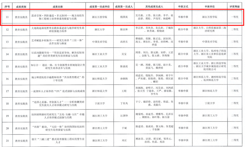 近日,浙江省研究生教育学会公布了第三届浙江省研究生教育学会教育成果奖获奖名单,由我校生物与医药学位点推选的教育实践类成果《需求引领·四阶递进·多元协同——地方高校生物工程硕士培养体系的探索与实践》荣获一等奖。该成果由我校独立完成,成果负责人为钱国英教授,这是我校首次获得浙江省研究生教育学会教育成果一等奖,同时是对我校十多年来研究生教育建设和发展的高度肯定。