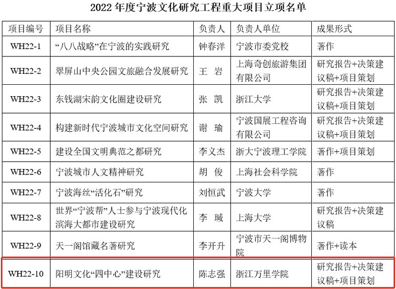 近日,宁波市哲学社会科学工作领导小组办公室公布2022年度宁波文化研究工程重大项目立项项目,我校陈志强教授团队申报的课题《阳明文化“四中心”建设研究》喜获立项。宁波市财政局、文化体制改革和发展工作领导小组办公室公布的2022年宁波市文化产业发展专项资金(数字文化)扶持项目,我校凤凰数字文化创意产业学院入选立项。