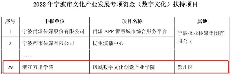 宁波市文化产业发展专项资金扶持项目重点支持发展新型文化企业、文化业态、文化消费模式,支持传统文化产业的数字化转型。我校凤凰数字文化创意产业学院以人才链、产业链、品牌链为抓手,充分整合“政产学研用”各方优势资源,是产科教协同发展、校企深度合作,服务经济社会高质量发展的样板和典范。