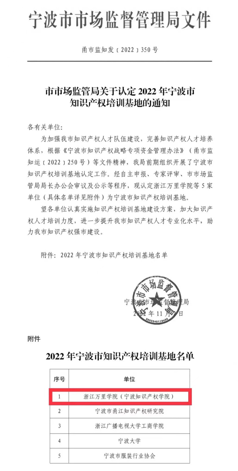 近日,经自主申报、专家评审、市市场监管局局长办公会审议及公示等程序,我校宁波知识产权学院正式获批成为宁波市知识产权培训基地。