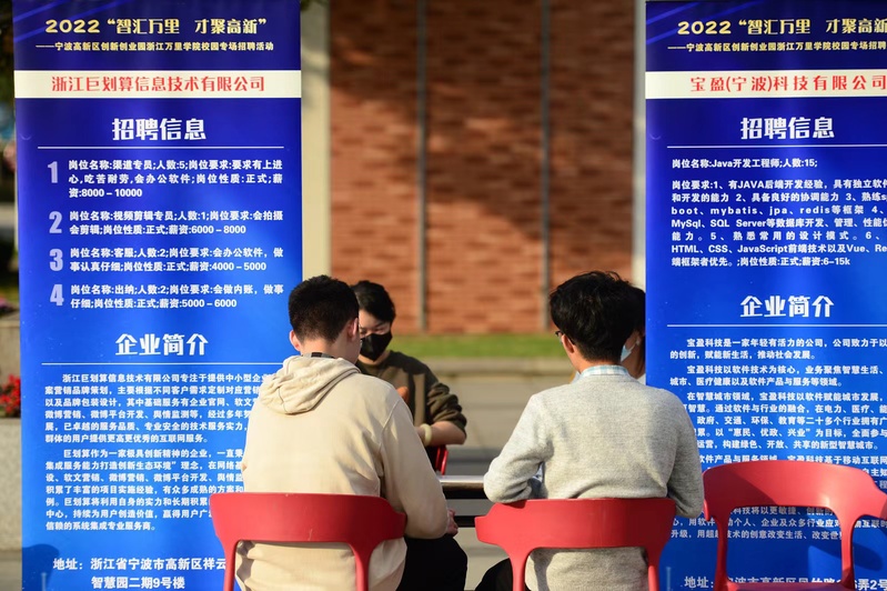 11月9日下午,2022“智汇万里 才聚高新”周二就业集市——宁波市高新区专场招聘活动在我校钱湖校区素拓小广场举办。