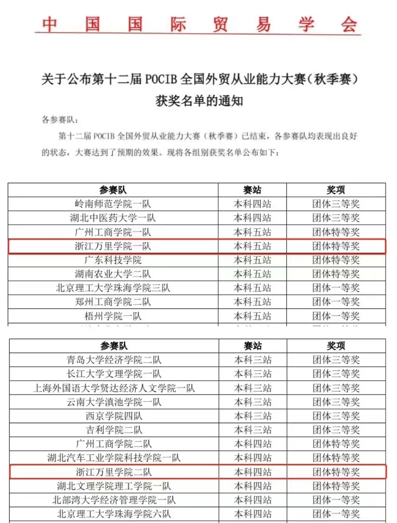 近日,我校商学院20名学生组成的两支竞赛团队在第十二届POCIB全国大学生外贸从业能力大赛上,分别以952.76分和952.68分获得所在赛站的团体特等奖,创我校参赛以来的历史最佳战绩。