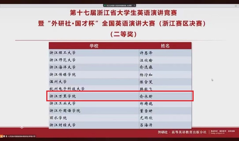 近日,2022“外研社·国才杯”全国英语演讲大赛(浙江赛区决赛)在线上举办,全省58所高校的171名选手汇聚一“线”,展开激烈角逐,我校文化与传播学院新闻学191班俞承盺获二等奖。