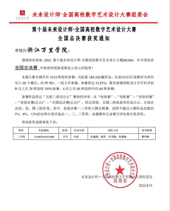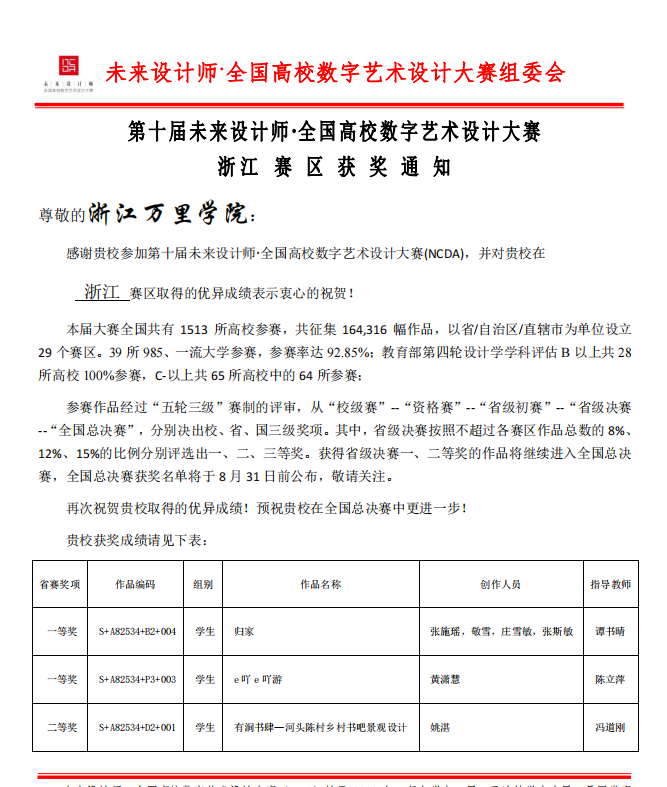 近日,由工业和信息化部人才交流中心、未来设计师·全国高校数字艺术设计大赛组委会主办的2022年第十届未来设计师·全国高校数字艺术设计大赛(NCDA)全国总决赛圆满落幕,我校设计艺术与建筑学院共计15件作品斩获大奖,其中获国赛二等奖1项,省赛一等奖2项、二等奖4项、三等奖9项。