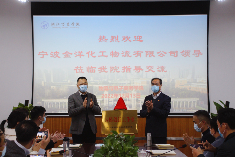 传承匠心 创新赋能。12月13日下午,我校物流与电子商务学院举行“劳模创新工作室”揭牌仪式。校党委书记蒋建军,校工会副主席(主持工作)杨忠辉,宁波金洋化工物流有限公司董事长顾明岳、总经理胡沛霖、公司党支部书记、工会主席翁永祥、总经理助理王斌出席揭牌仪式。物流与电子商务学院党政班子和师生代表参加会议。