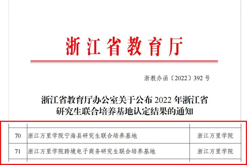 近日,浙江省教育厅办公室公布了2022年浙江省研究生联合培养基地认定名单,我校牵头建设的“浙江万里学院宁海县研究生联合培养基地”和“浙江万里学院跨境电子商务研究生联合培养基地”喜获2022年浙江省研究生联合培养基地认定。