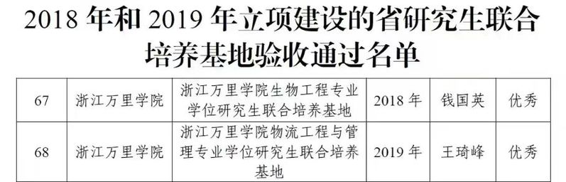 此次认定是继我校2018年和2019年分别获批的“浙江万里学院生物工程专业学位研究生联合培养基地”“浙江万里学院物流工程与管理专业学位研究生联合培养基地”以优秀成绩通过验收后,在省级研究生联合培养基地建设上的又一重要突破。自此,我校总共有四个研究生联合培养基地获得省教育厅的认定。