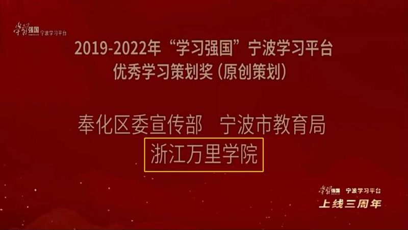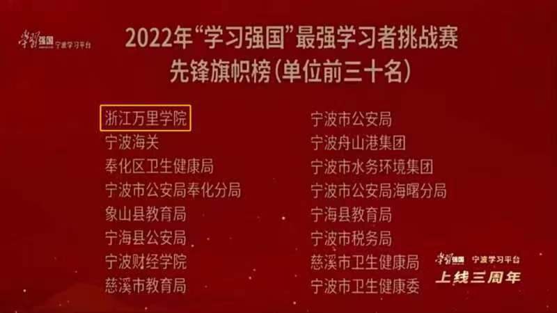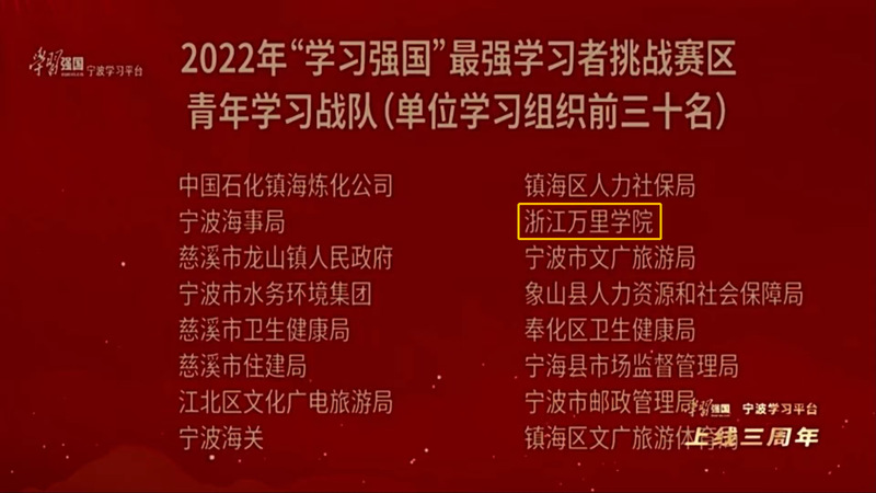 从2019年12月12日到2022年12月12日,“学习强国”宁波学习平台经过三年奋进,结出累累硕果。万里青年更是积极主动,在强国平台上留下了自己的“青春足迹”。无论是青年学生还是老师,全校上下都积极投入到学习理论知识的浪潮中,不断展现“万里风采”。长期以来,学校党委高度重视青年大学生理论武装工作,引导广大青年运用马克思主义立场、观点、方法观察分析问题,从而坚定正确政治方向,增强道路自信、理论自信、制度自信、文化自信,坚定听党话、跟党走的人生追求。除在宁波学习平台的品牌活动“‘学习强国’最强学习者”答题挑战赛中取得骄人成绩,我校还在浙江省大学生科技竞赛A类赛事中唯一的马克思主义理论知识竞赛——“卡尔·马克思杯”浙江省大学生理论知识竞赛中,连续两年蝉联一等奖和优秀组织奖。