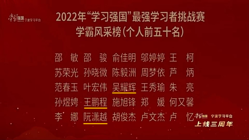 活动现场公布了“学习强国”最强学习者挑战赛2022年“学霸风采榜”前50名名单、“先锋旗帜榜”前30名名单、 “青年学习战队榜”前30名名单、“区域热度榜”前3名名单及2019-2022年“学习强国”宁波学习平台优秀学习录用奖、优秀学习供稿奖、优秀学习策划奖等奖项名单。我校位列“先锋旗帜榜”榜首、“青年学习战队榜”第四名,还获得优秀学习策划奖、优秀学习挑战奖,8名师生入选“学霸风采榜”前50名榜单,可谓是夺得大满贯。