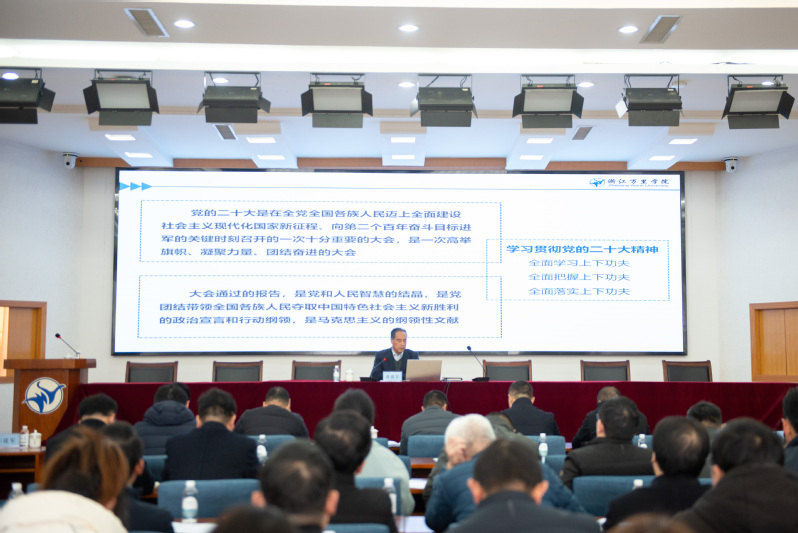 动员会后,蒋建军作党的二十大精神专题辅导报告。他从深刻把握大会具有的里程碑意义和取得的丰硕成果,深刻把握二十大主题是统摄全局的“纲”与“魂”,深刻把握新时代10年伟大变革的里程碑意义,深刻把握习近平新时代中国特色社会主义思想实现的发展新跨越,深刻把握中国式现代化的中国特色、本质要求和重大原则,深刻把握推进社会主义现代化国家建设的系统部署,深刻把握抓关键、补短板、防风险的战略考量,深刻把握坚持党的全面领导和全面从严治党的新形势新要求,深刻把握应对风高浪急甚至惊涛骇浪重大考验的清醒坚定等九个方面带着全体干部进一步深入学习领会党的二十大精神的核心要义和丰富内涵,深刻领悟“两个确立”的决定性意义,牢记“国之大者”,增强“四个意识”,坚定“四个自信”,坚决做到“两个维护”,全面落实“立德树人”根本任务,自觉履行为党育人、为国育才的责任使命,以实际行动践行对党的忠诚,进一步增强推动学校高质量发展和服务广大师生的本领。