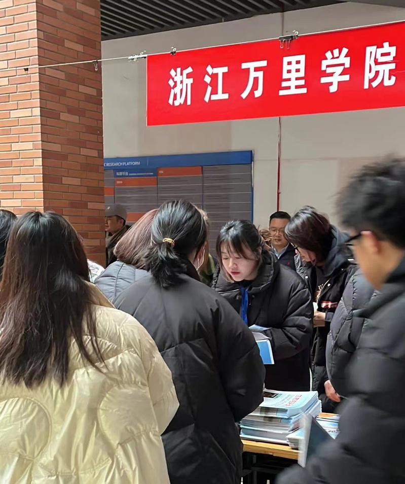 活动现场人声鼎沸,一万多名考生及家长把每个招生摊位围了个里三层外三层,招生老师们一刻不停地回答着问题。“活动开始没一会,我们的宣传册就被领光了”,我校现场志愿者说道。一位来自余姚的家长对我校生物与环境学院的专业非常感兴趣,并直言她孩子的目标就是我校生物工程类专业,并且“来万里之后觉得校园环境非常好,老师也很有耐心。”还有家长特地从象山赶来参加这场咨询会,“线下面对面的交流确实很方便,也可以从老师这了解到许多我们之前在网络上了解不到的信息,来一趟很值得。”