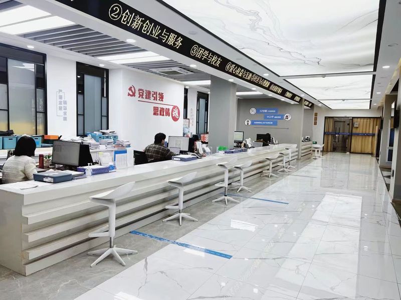 大厅党群服务中心建筑面积达3000平,各功能区划分合理,环境整洁美观,实现学校师生线下线上“一站式”便捷综合服务,为师生学习、工作和生活提供方便。内设综合事务、权益维护、爱心互助、创新创业、就业指导、团学活动、校友服务、社区服务、心理健康、继续教育、驾驶培训、一卡通服务等子中心服务窗口,并新增了教师服务、校友服务等窗口,从早上8:00到晚上20:30为师生提供150多个服务项目,日均服务师生500余人次。