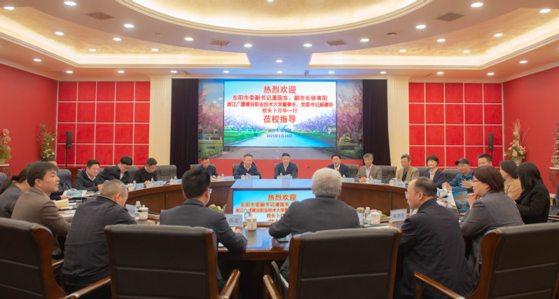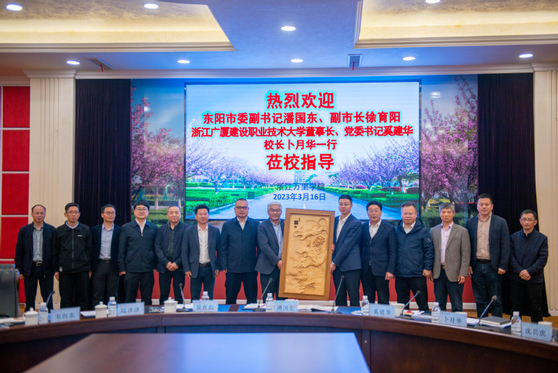 3月16日上午,东阳市委副书记、政法委书记潘国东,副市长徐育阳,浙江广厦建设职业技术大学党委书记、董事长奚建华,校长卜月华一行来我校调研交流。校长应敏,党委副书记、副校长王伟忠,副校长徐立清,秘书长王福银,财务总监张剑青等接待并出席座谈会。