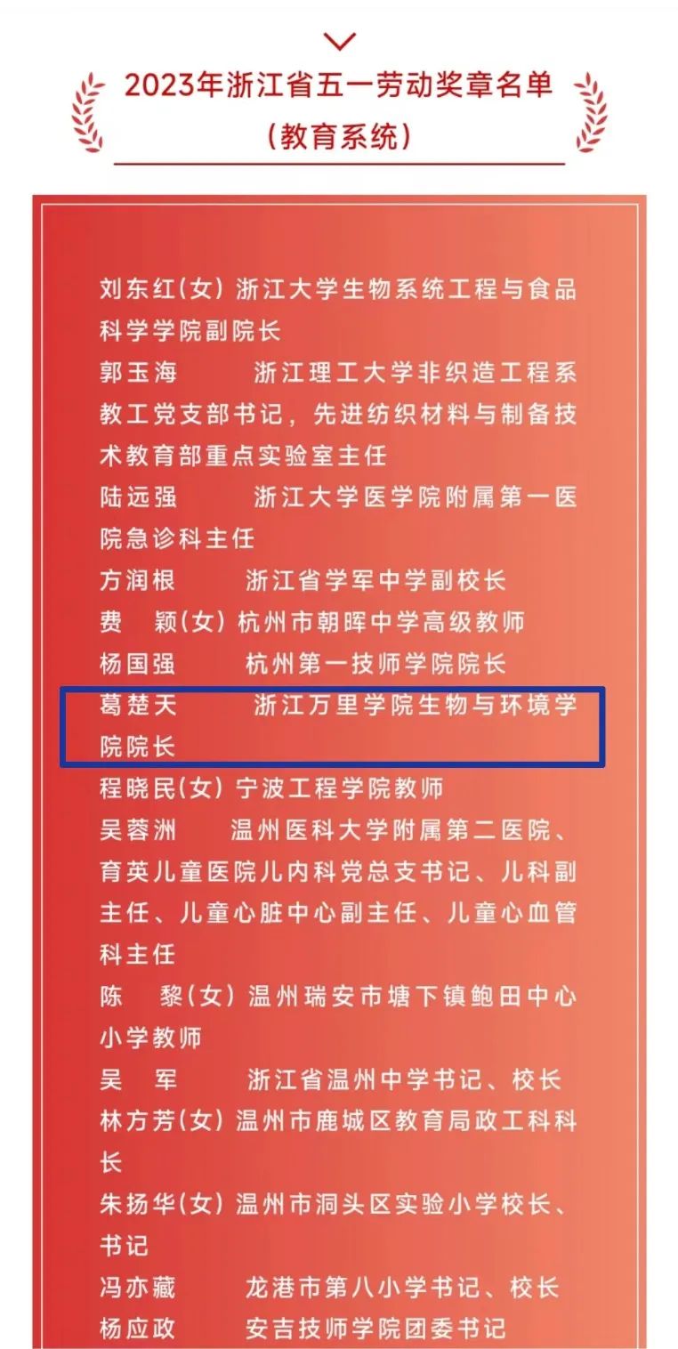 近日,浙江省总工会《关于表彰2023年浙江省五一劳动奖状、奖章和工人先锋号的决定》下发,我校生物与环境学院院长葛楚天荣获“浙江省五一劳动奖章”荣誉称号,这也是继2016年柳敏海老师、2018年陈忠法老师入围之后,我校教师第三次获此奖项。
