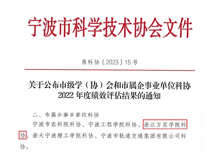 4月3日,宁波市科学技术协会公布市级学(协)会和市属企事业单位科协2022年度绩效评估结果,我校科协被评为优秀企事业单位科协,这也是我校连续第三次获此殊荣。
