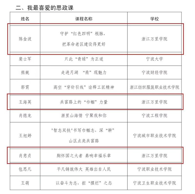 近日,“思政有温度”在甬高校思政微课评选结果公布,经学校推荐、专家评审、网络评选等环节,评选出10门“我最喜爱的思政课”。我校马克思主义学院陈金波老师的“守护‘红色四明’根脉,把革命老区建设得更好”、王海英老师的“共富路上的‘巾帼’力量”和肖意贞老师的“胸怀国之大者 奏响幸福乐章”等三门课位列其中。