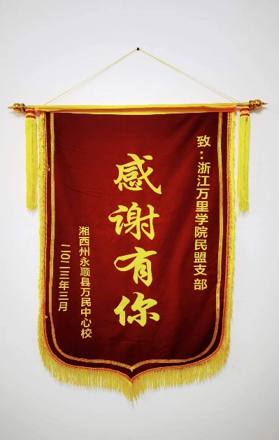 近日,民盟浙江万里学院支部主委余丹老师收到了一份特殊的礼物——来自湖南省湘西土家族苗族自治州永顺县万民乡中心学校寄赠的锦旗,上面用行楷写了一句简单朴素的话“感谢有你!”