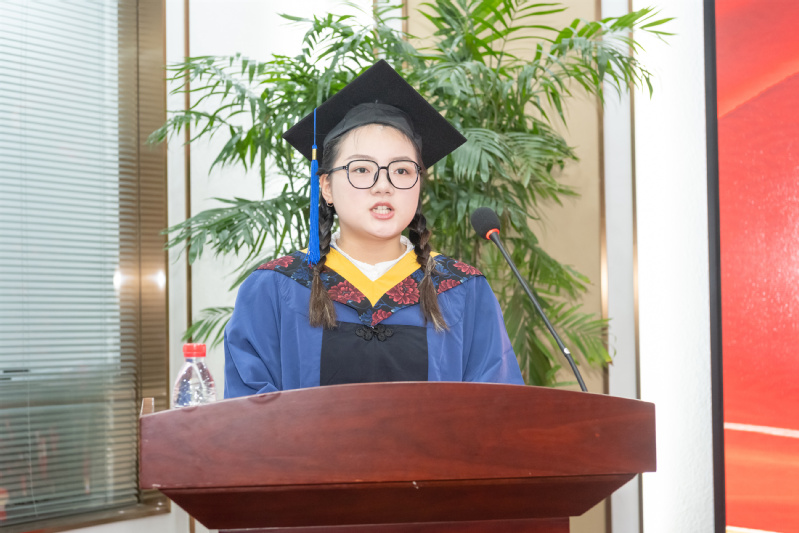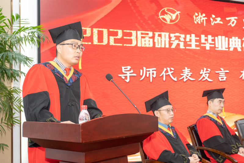 工程管理学位点的导师郁玉兵、生物医药学位点的研究生谢周云、工程管理学位点的校友王清晨分别代表导师、毕业生、优秀校友发言。郁玉兵勉励大家要心中有梦、奋勇向前、学而不止、脚踏实地,在奋斗中实现自我价值。谢周云代表2023届研究生向母校和导师们致以深深感谢与眷念,并代表全体毕业研究生庄重承诺,会时刻铭记母校校训,秉承万里精神,去成就更美好和更优秀的人生。现就职于绍兴市上虞区综合行政执法局的2022届物流工程专业研究生王清晨代表校友祝贺学弟学妹们顺利完成学业,并以切身经历鼓励学弟学妹们踔厉奋发、笃行不怠,并真诚祝愿母校早日成功更名大学并获批博士学位授予单位。