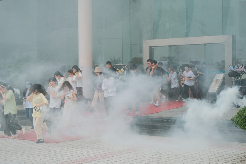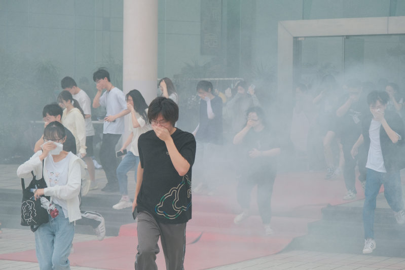 此次疏散演练以图书馆一层阅览室为模拟起火地点,在相应的模拟位置点燃消防烟雾弹。随着烟雾升起和警报声响起,学生弯腰低头,捂住口鼻,沿着疏散楼梯依次、有序、快速撤离到指定疏散地点。整个疏散过程中,全体学生反应敏捷、行动迅速规范、撤离井然有序,未出现人员聚集踩踏等情况。