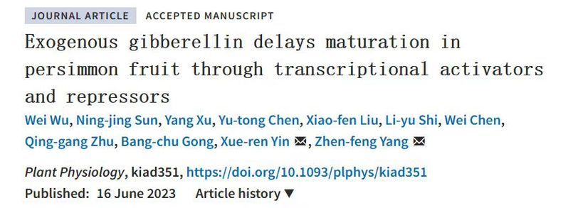 近日,我校杨震峰团队发表在在《植物生理学》(Plant Physiology)的一篇研究论文 《外源赤霉素处理通过转录激活子和抑制子延缓柿果实成熟》(Exogenous gibberellin delays maturation in persimmon fruit through transcriptional activators and repressors),找到了调控柿果实成熟的“密码”