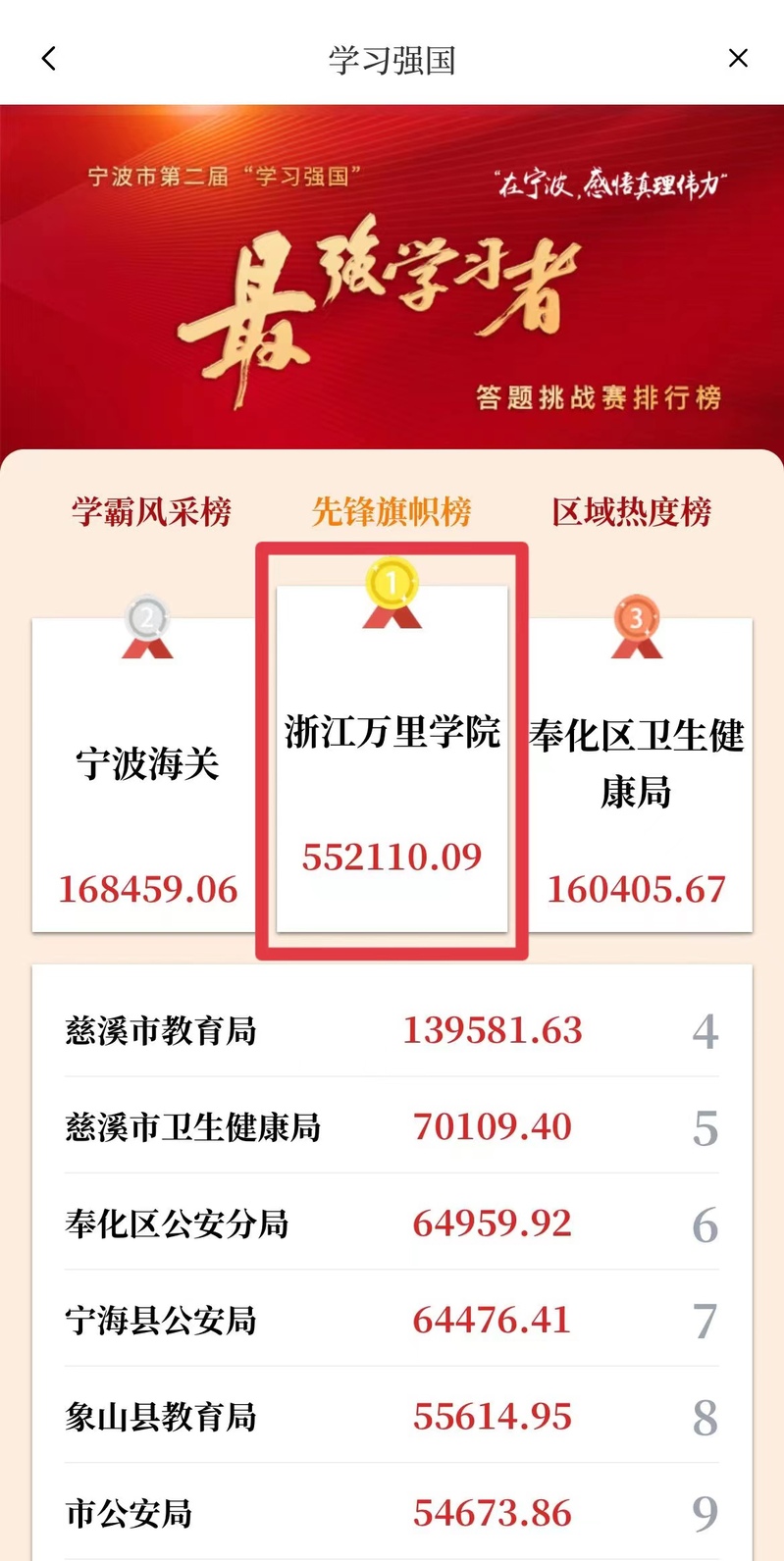 十个月,22期,“在宁波,感悟真理伟力”——宁波市第二届“学习强国”最强学习者答题挑战赛于近日落下帷幕,我校凭借师生不俗的理论知识功底,连续22期夺得榜首!在首届“学习强国”最强学习者答题挑战赛八期比赛中,我校也连续七期夺得榜首。
