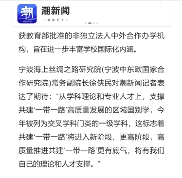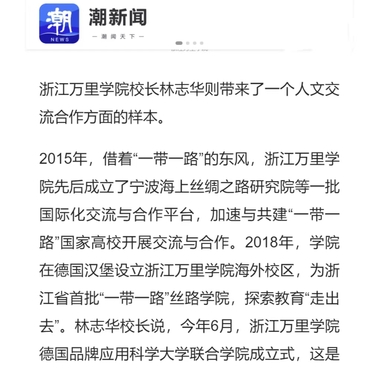 10月23日,浙江日报报业集团下属省级重大新闻传播平台“潮新闻”要闻头条发表《“东方大港”宁波:扬帆世界,奋“甬”向前》一文,文章主要讲述拥有世界顶级大港的宁波,交出了高质量参与共建“一带一路”的成绩单。其中,我校“人文交流合作方面的样本打造”被关注报道,校长林志华出镜接受采访。