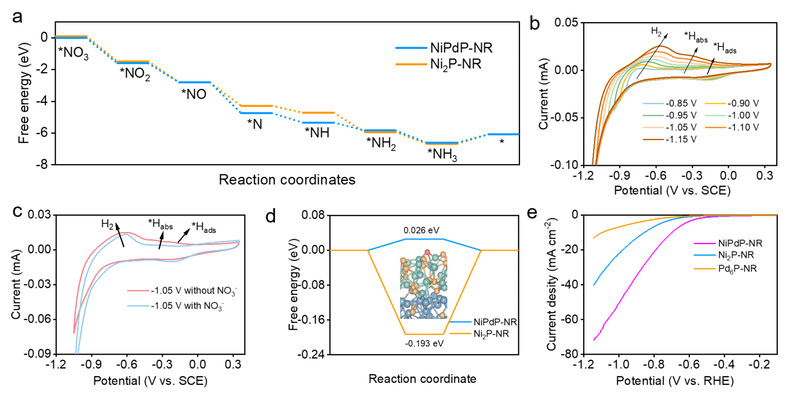 图1. Ni2P/Pd6P催化剂的制备流程以及硝酸盐还原合成氨的反应机理