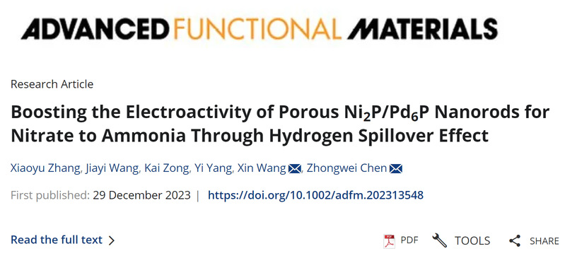 近日,碳中和研究院研究团队在国际顶级期刊Advanced Functional Materials发表题为《氢溢流效应促进多孔Ni2P/Pd6P纳米棒催化硝酸盐电还原合成氨性能》的研究论文。Advanced Functional Materials是材料科学领域顶级期刊,主要刊载纳米技术、材料物理及化学和生物材料等方面的突破性研究和综述文章,2023年影响因子为19.0。浙江万里学院为第一署名单位,陈忠伟、王新为通讯作者,碳中和研究院青年教师张晓雨为第一作者。